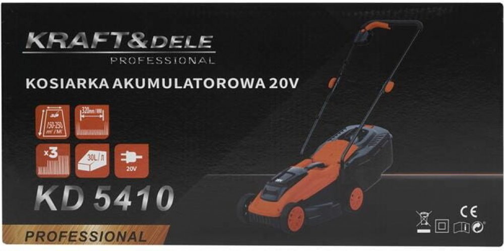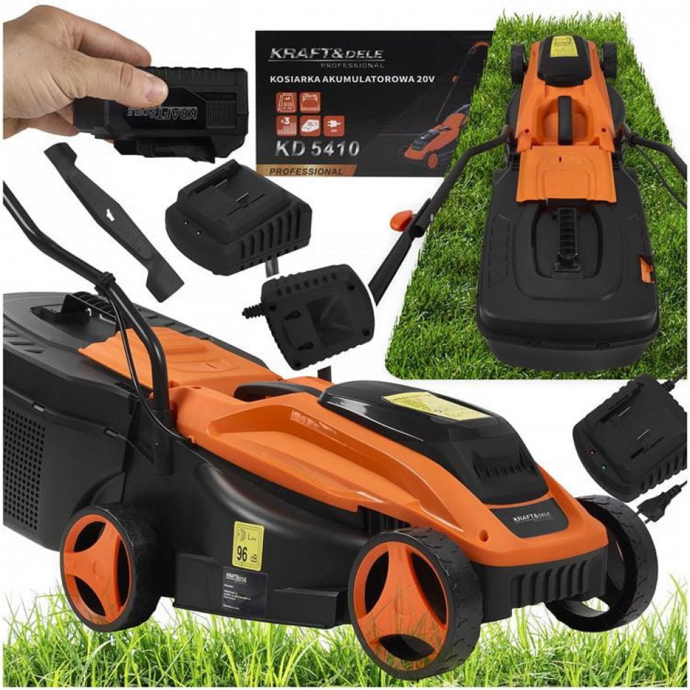 - TECHNICZNE PRODUKTU Marka: KRAFT&DELE Model: KD5410 Napięcie: 20V Baterie: 6,0Ah Pojemność zbiornika na trawę 30L Regulacja koszenia: 25-65mm Obudowa urządzenia jest wykonana z tworzyw sztucznych dzięki czemu udało się stworzyć urządzenie ultra lekkie. Wpływa to bardzo pozytywnie na brak zmęczenia podczas czynności związanych z manewrowaniem oraz prowadzeniem kosiarki. Niewielkie wymiary pozwolą na dotarcie do miejsc ciężko dostępnych dla szerokich oraz ciężkich kosiarek spalinowych. Urządzenie wyposażone jest w pojemny 30 litrowy kosz na ściętą trawę. Konstrukcja kosza została przez nas dokładnie przemyślana, stworzony z tworzywa sztucznego, z uchwytem do przenoszenia. Skład zestawu: