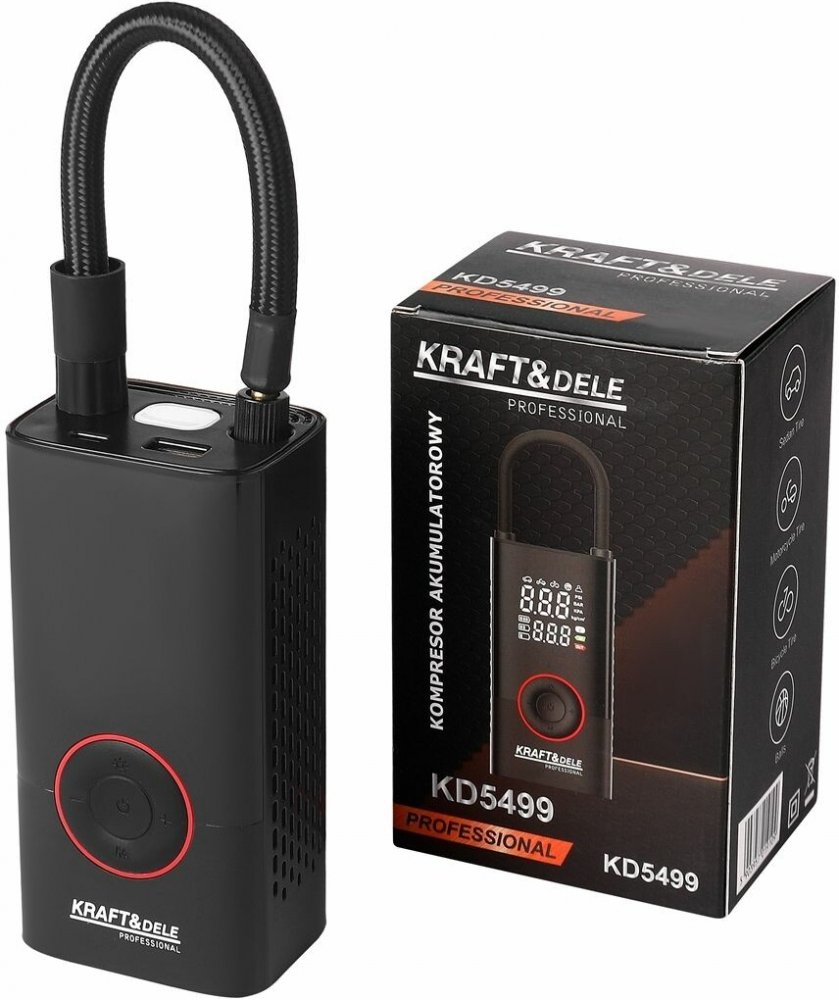 Kompresor Kraft&Dele KD5499 je komfortní a přenosný elektrický pomocník s výkonným akumulátorem 4000mAh, díky kterému lze nafukovat pohodlně bez nutnosti připojení k síti. Integrovaná LED svítilna zvyšuje bezpečnost používání například při nočním opravování pneumatik. Jednoduché ovládání přes LCD displej umožňuje snadný výběr a kontrolu měřících jednotek (PSI, BAR, KPA, KG/CM²). Díky automatickému...