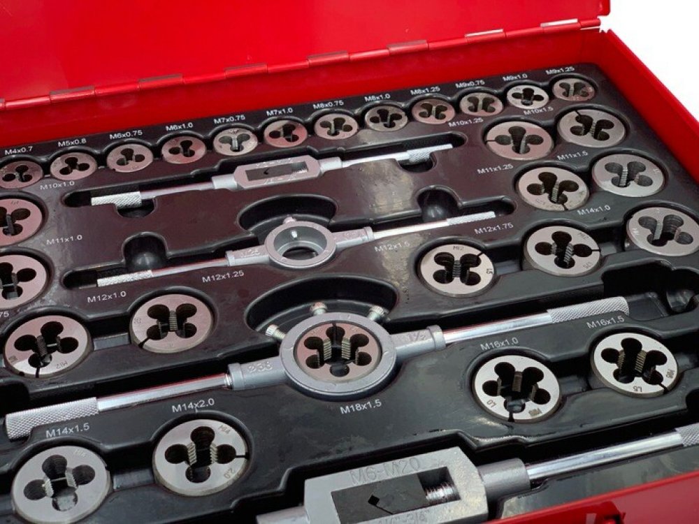 110-dílná sada metrických závitníků a závitových oček ze standardní nástrojové oceli pro ruční závitování pomocí vratidla.]