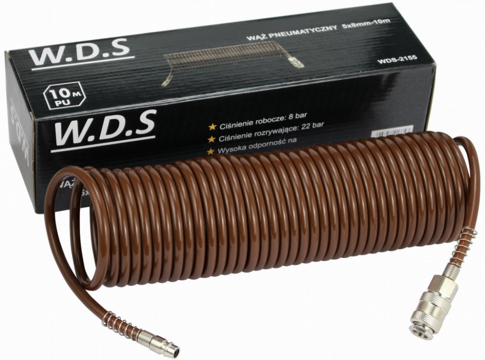 Pneumatická spirálová hadice WDS2155 značky W.D.S o délce 10 metrů je spolehlivým a praktickým řešením pro použití s pneumatickým nářadím, jako jsou brusky, stříkací pistole, rázové utahováky a další nástroje. Vhodná je pro profesionální dílny, autoservisy i domácí garáže.