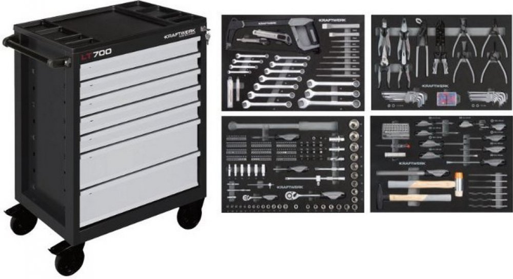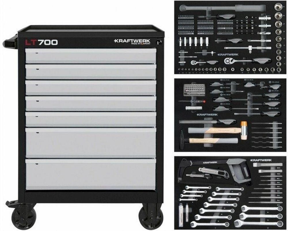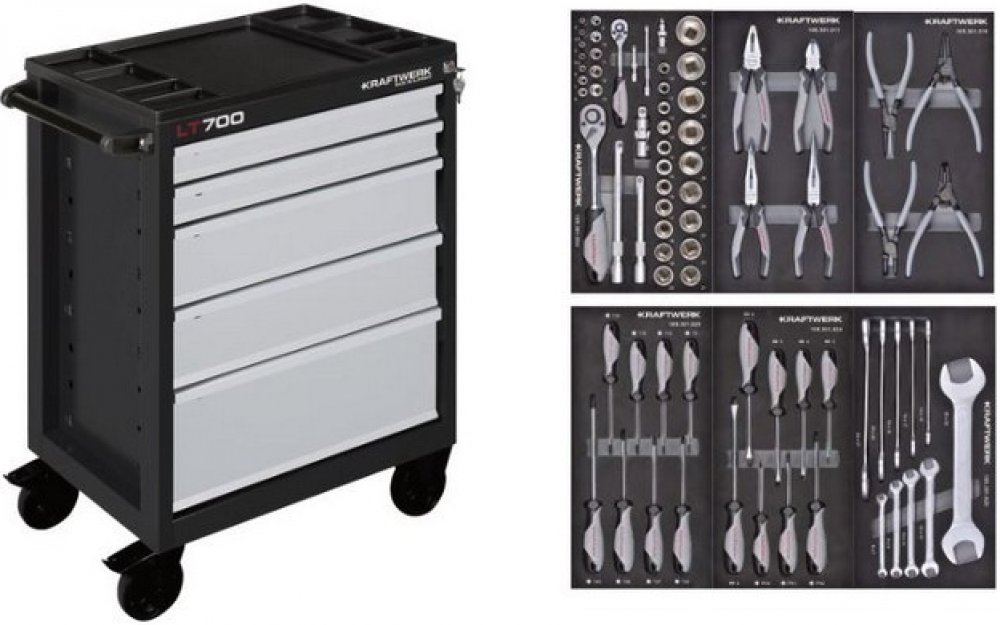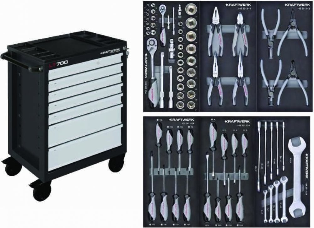 14mm - nástavce 1/2": 14 - 32mm - sada kleští segerových 4ks - sady šroubováků ploché + křížové + Torx - sady klíčů "T" rukojeť Inbus + Torx - sada kladiv a paličky - sada pilníků, kartáč, posuvné měřidlo - dílenský vozík LT700 7 zá