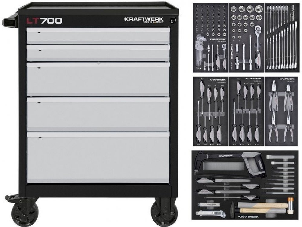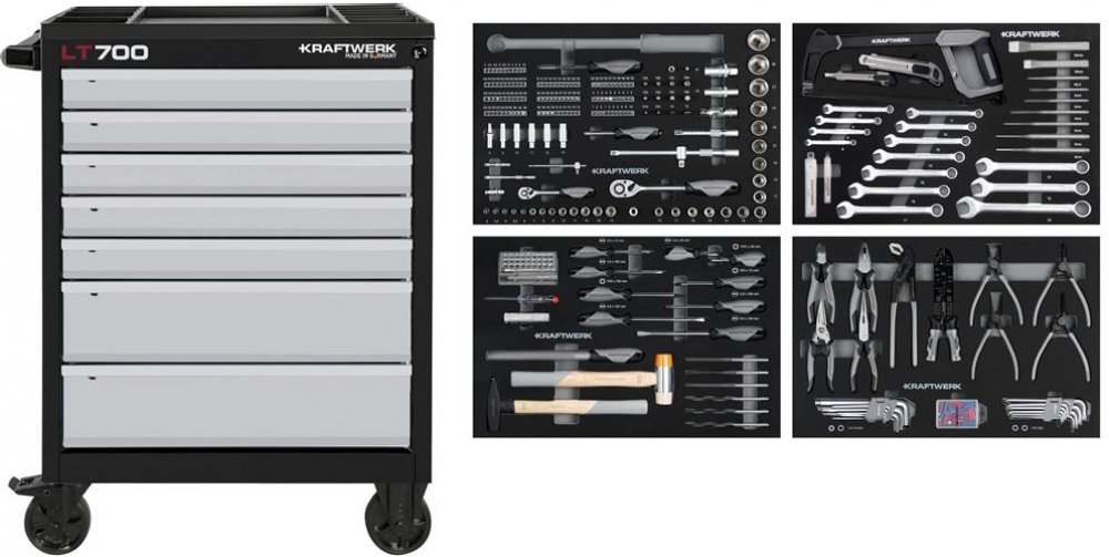 - MADE IN GERMANY - 257ks nářadí uloženo v 4 speciálních vložkách z pěny (EVA) 60 x 40 cm - 4 plně vybavené moduly -> 4 vybavené zásuvky - klíče očkoploché: 8 - 24mm - klíče ráčnové: 8 - 19mm - ráčny 1/4" + 1/2" - nástavce 1/4": 4,0 -
