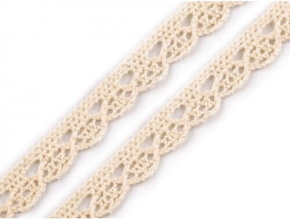p Paličkovaná bavlněná krajka je vhodná na ozdobení lemů ubrusů, deček nebo polštářů. Používá se také na lidové kroje a je oblíbená při výrobě lapačů snů. br / Krajku doporučujeme žehlit přes tkaninu. br / Šíře 14mm. /p