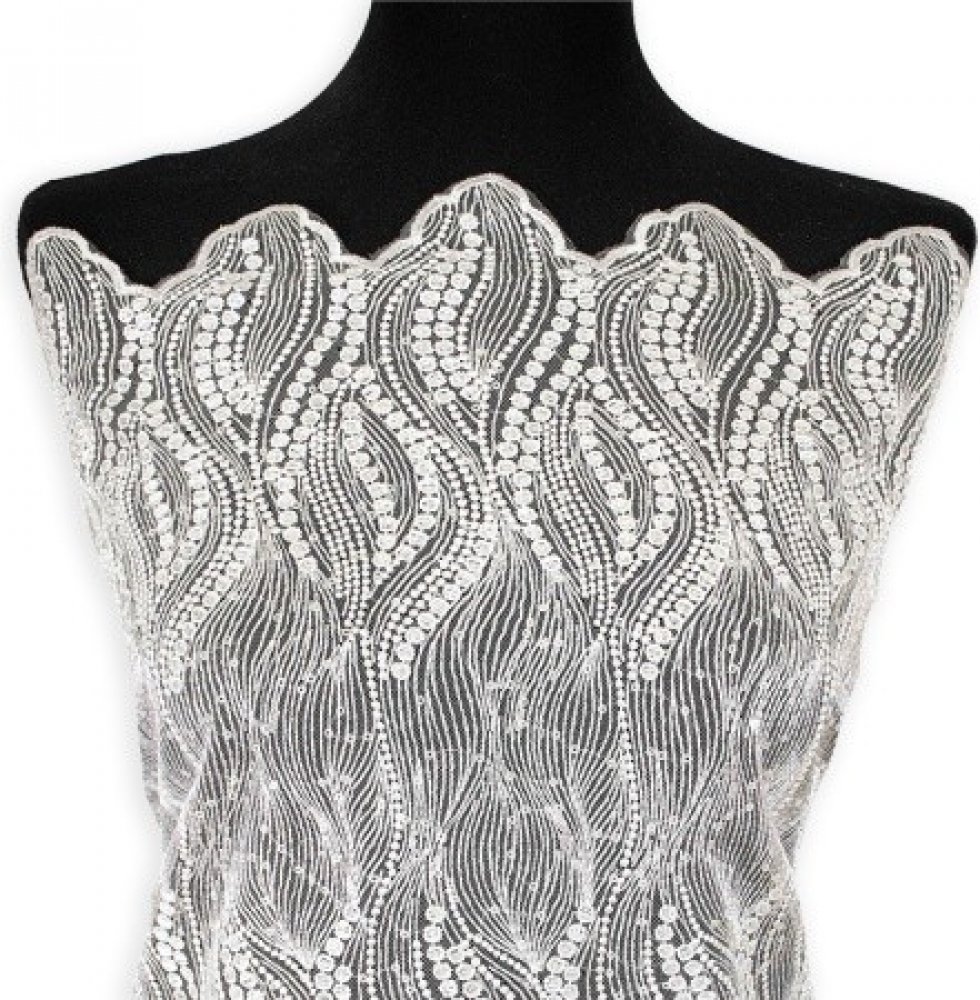 - nádherná svatební krajka v bílé barvě se vzorem jemných vlnek a s drobnými flitry - po obou stranách ozdobná bordura - lze samozřejmě použít i pro jiné účely, jako na halenky, sukně, ozdoby, apod. - ke krajce lze dokoupit satén, tyl nebo šifon - šíře krajky: 120 cm, 250 g/m2 - Dovoz: EU