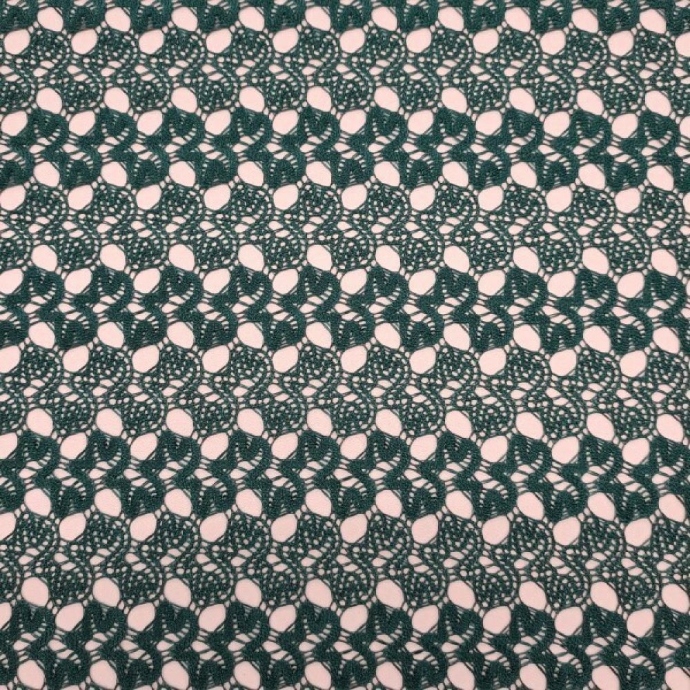 Tmavě zelená vzorovaná krajka. Složení krajky 100% polyester. Šířka metráže 150 cm. Krajkovina se používá k výrobě dámských slavnostních oděvů. Krajky se rovněž využívají ke zdobení dámského prádla a oděvů.
