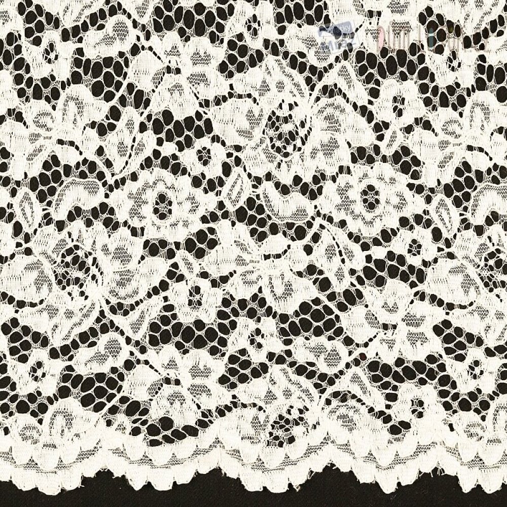 Metrážová květinová krajka s ozdobnou bordurou po obou stranách šíře látky. Krajka je pevná a nepruží, je vhodná na svrchní tričko, nebo top, na svrchní vrstvu podšitých šatů, nebo sukní, nebo jako krajková vsadka všude tam, kde chcete oživit svůj módní kousek.