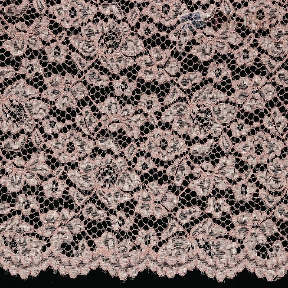 Metrážová květinová krajka s ozdobnou bordurou po obou stranách šíře látky. Krajka je pevná a nepruží, je vhodná na svrchní tričko, nebo top, na svrchní vrstvu podšitých šatů, nebo sukní, nebo jako krajková vsadka všude tam, kde chcete oživit svůj módní kousek.
