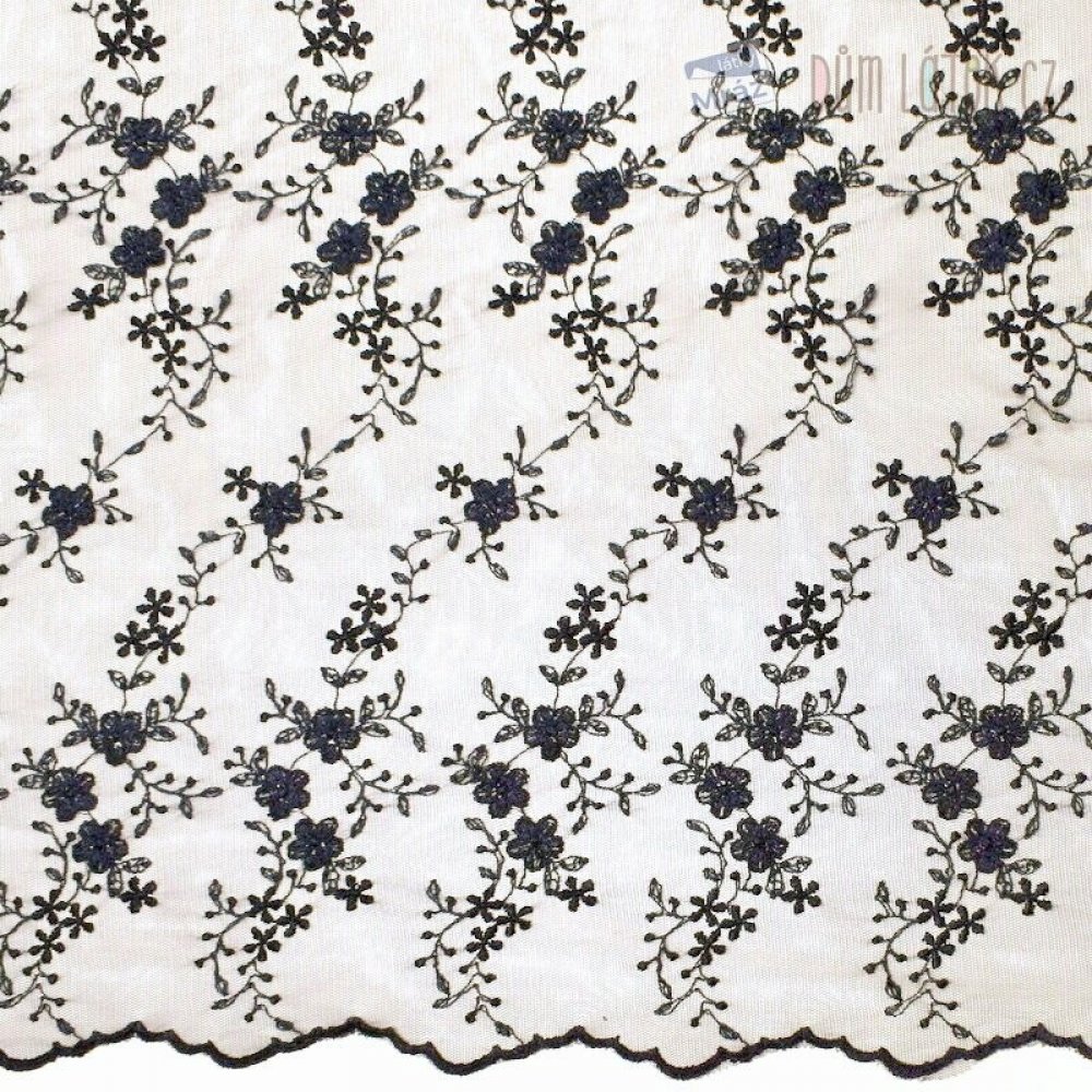 Krajka s květy v temně modré. Ideálně ji lze využít na sukně, šaty či jako zdobné prvky oděvu.