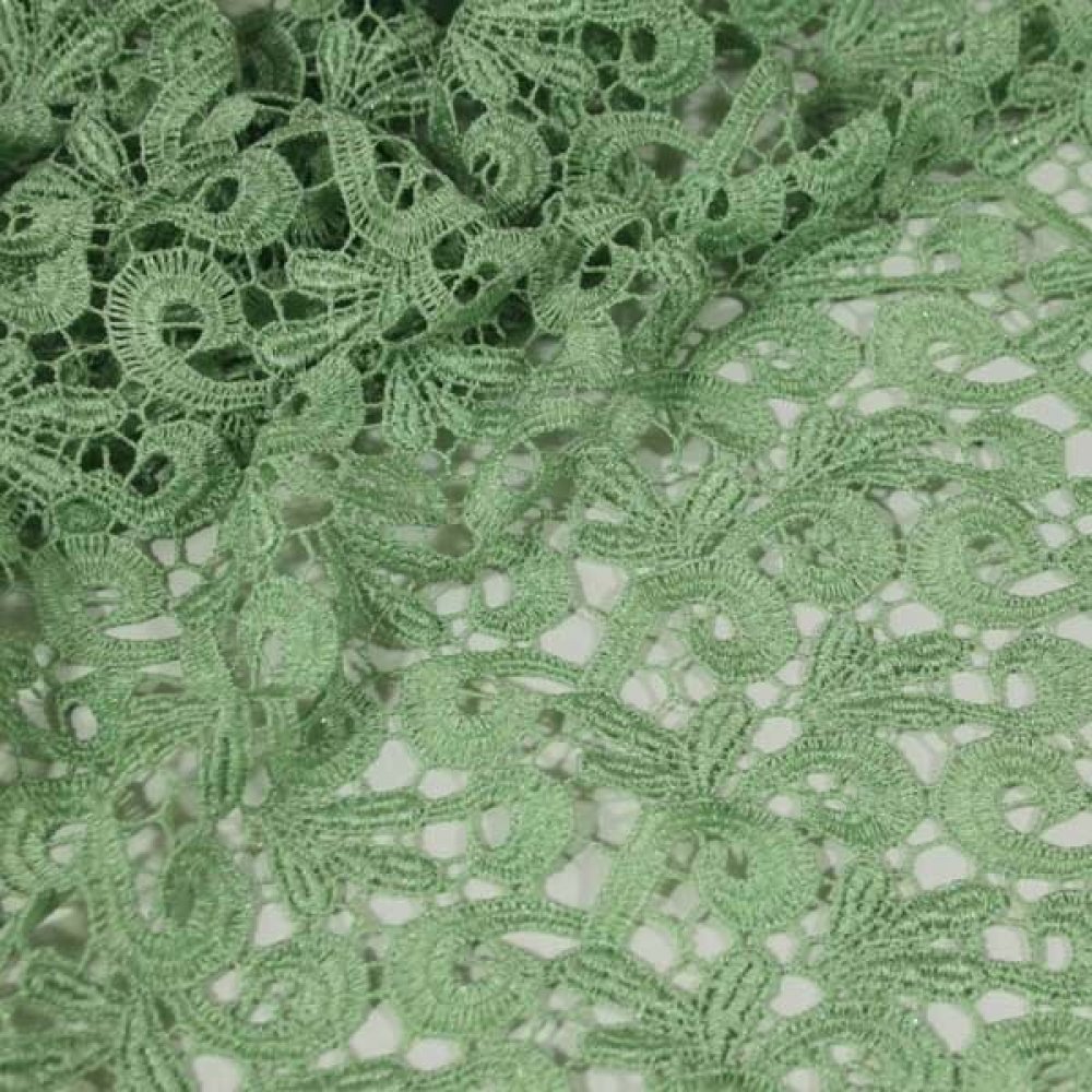 Světle zelená krajka s leskem. Složení krajky je 75%polyester, 25%lurex. Metráž má šířku 135 cm.