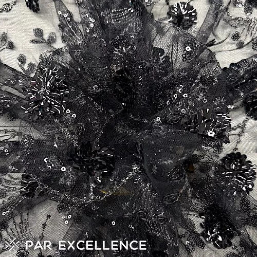 Našli jste černou krajku, která povyšuje večerní kreace na úroveň haute couture. Jemný, lehký a průhledný materiál se zřetelnou strukturou je celoplošně vyšívaný třpytivými flitry a stříbrnou nití na delikátním černém tylovém podkladu, takže působí efektně z každého úhlu. Ozdobný obloučkový okraj vede podél obou pevných krajů a vytváří důmyslný detail pro rafinované zakončení. Tato látka z kolekce Dior se vyznačuje dvoubarevným vzhledem daným kontrastem černých a stříbrných akcentů, látka je nabíz