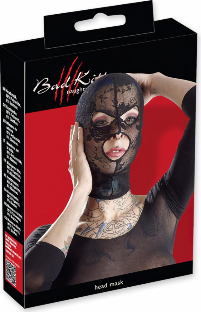 Krajková maska s výřezem pro oči a ústa. Barva černá. Univerzální velikost. Materiál 92% polyester, 8% elastan. Výrobce Orion (SRN).