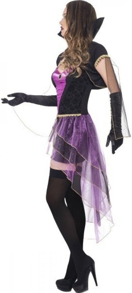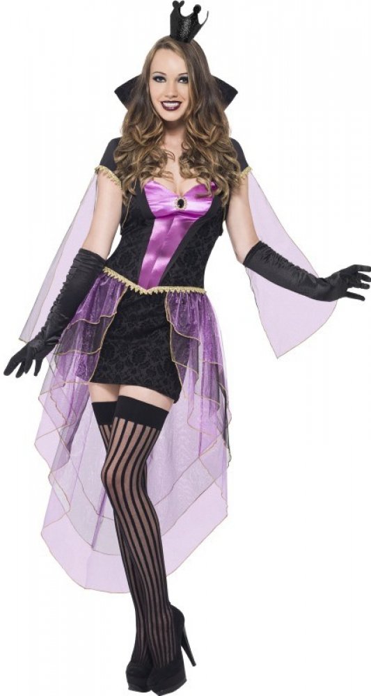Karnevalový kostým královny, šaty s vlečkou a živůtkem s límcem, barva černo-fialová.