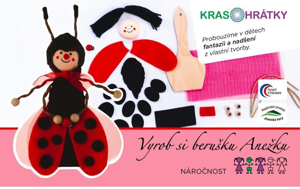 Vyrobte si vlastní berušku Anežku z dílny výtvarnice Pavly Petrnouškové. Všechny sady KRASOHRÁTKY jsou pro vás připravovány ručně, s láskou a z podhůří Jizerských hor vracejí dětem přirozenou radost ze hry. Autorské sady výtvarnice Pavly Petrnouškové jsou určené ke kreativnímu tvoření pro všechny bez rozdílu věku, kteří milují rukodělnou práci. Krasohrátky využívají přirozené potřeby tvořit a jsou povýšeny o didaktické a metodické prvky. Ztvárněním přírodních motivů květin, broučků, motýlů, zvířátek, skřítků a jejich polidštěním si děti vytvářejí vztah k jednotlivé postavičce, hrají si s ní a rozvíjejí vlastní příběhy. Děti mají rády práci s přírodními materiály, baví je používat titěrné ozdoby, semínka, lesní plody, korálky, proto vznikla řada inspirovaná přírodou. V sadě je vše, co potřebujete ke kreativnímu tvoření. Vhodné od 7 let.