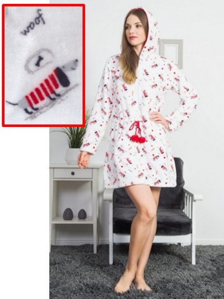 Krátký župan na zip, s kapucí a bambulemi. Dámský krátký župan, celý potištěný obrázky pejska v červeném svetříku, myslí na kost. V pase kontrastní šňůrka, zakončená bambulemi, po bocích praktické kapsy. Župan je vhodný i pro teens děvčata (164/170).