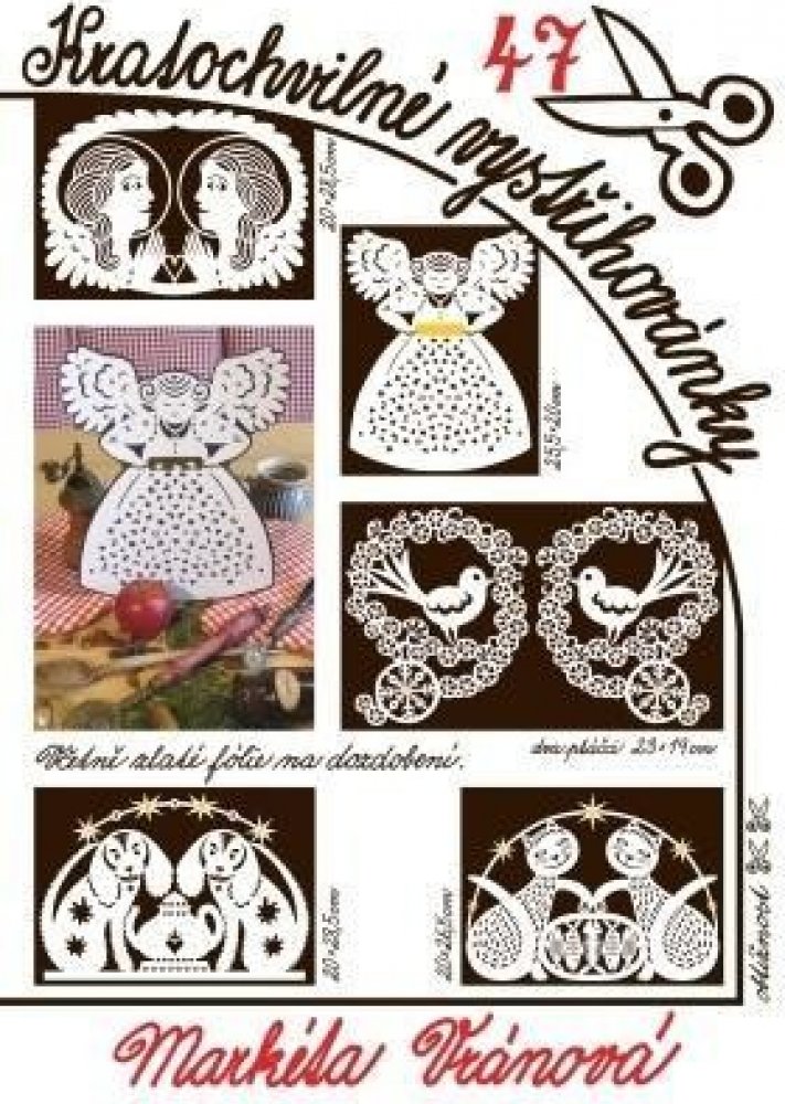 Nové dekorace vystřihováním - vystřihovánky mohou být využity k výzdobě oken i jiných míst Kratochvilné vystřihovánky mají široké využití k výrobě různých dekorací. Vystřižené obrázky můžete zavěsit do oken, na dveře, stěnu nebo do prostoru v jednoduchém rámečku. Obrázky připevněné ke špejli poslouží jako zápichy do květináčů. Jako součást přáníček potěší Vaše blízké. Nabízíme je v mnoha tématických souborech. Na titulní straně každého souboru jsou vyobrazeny vystřihovánky s uvedenými rozměry, které najdete v aktuální velikosti uvnitř. Z vložených listů můžete podle popisu (na zadní straně) hned začít vystřihovat. Některé soubory obsahují další zdobné prvky (barevný papír, zlatou fólii, pásky na zhotovení rámečků pro závěsné vystřihovánky, průsvitný transparentní papír). Obtížnost vystřihování je od souboru číslo 31 značena vpravo na obálce symbolem nůžtiček: jedny nůžtičky - lehké, dvoje nůžtičky - střední, troje nůžtičky - pro pokročilé. Soubor obsahuje:Andělé strážní – 20 x 28,5 cm Anděl s válečkem – 25,5 x 20 cm Dva ptáčci – 23 x 19 cm Pejsci – 20 x 28,5 cm Mlsné kočky – 20 x 26,5 cm zlatá fólie na dozdobení vystříhaných obrázků. Obtížnost - střední.