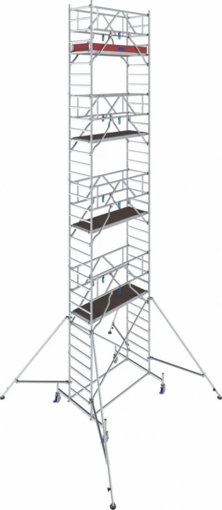Od výšky 4,40 m jsou součástí sady robustní ocelové stabilizátory. Při ještě vyšším sestavení (od 7,40 m) se doplňují teleskopické výložníky s výškově nastavitelnými patkami, které garantují stabilitu i na nerovných površích.