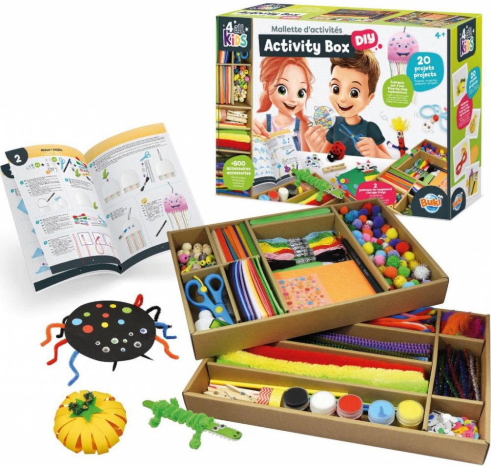 Děti si mohou vyrobit např. včelku, větrný mlýn, krokodýla, záložku, masku, kartičku s bambulkami a mnoho dalšího. K dispozici je více než 800 doplňků, včetně nůžek, barevného papíru, standardních, obřích nebo třpytivých čističů dýmek, bavlněných nití, dřevěných tyčinek, knoflíků, mosazných uzávěrů, plsti, fixu, barvy atd.