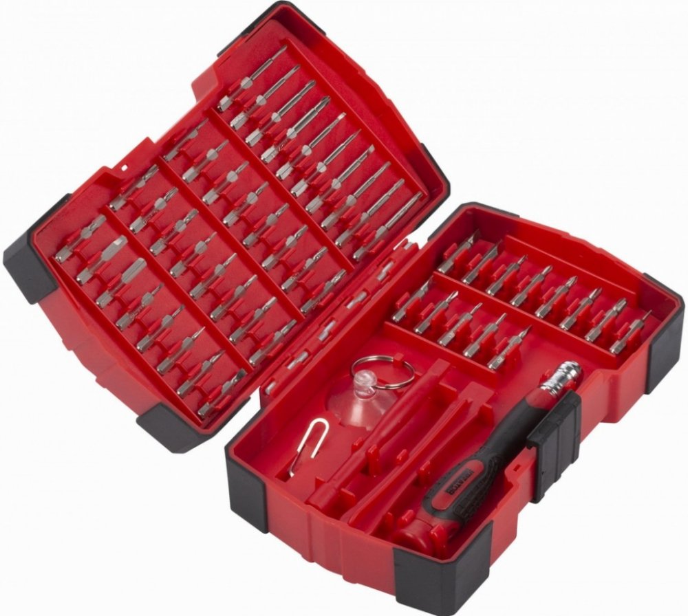 Tato rozsáhlá 52-dílná sada je určena pro přesné opravy nejrůznější druhy elektroniky a drobných spotřebičů. Pomocí přísavky, 2 plastových otvíráků konektorů, rukojeti pro šroubovák, jehly SIM karty a různých druhů přesných bitů můžete snadno provádět pečlivé opravy. Sada je dodávána v praktickém pouzdru s pogumovanými rohy o rozměru 173x113x53 mm.