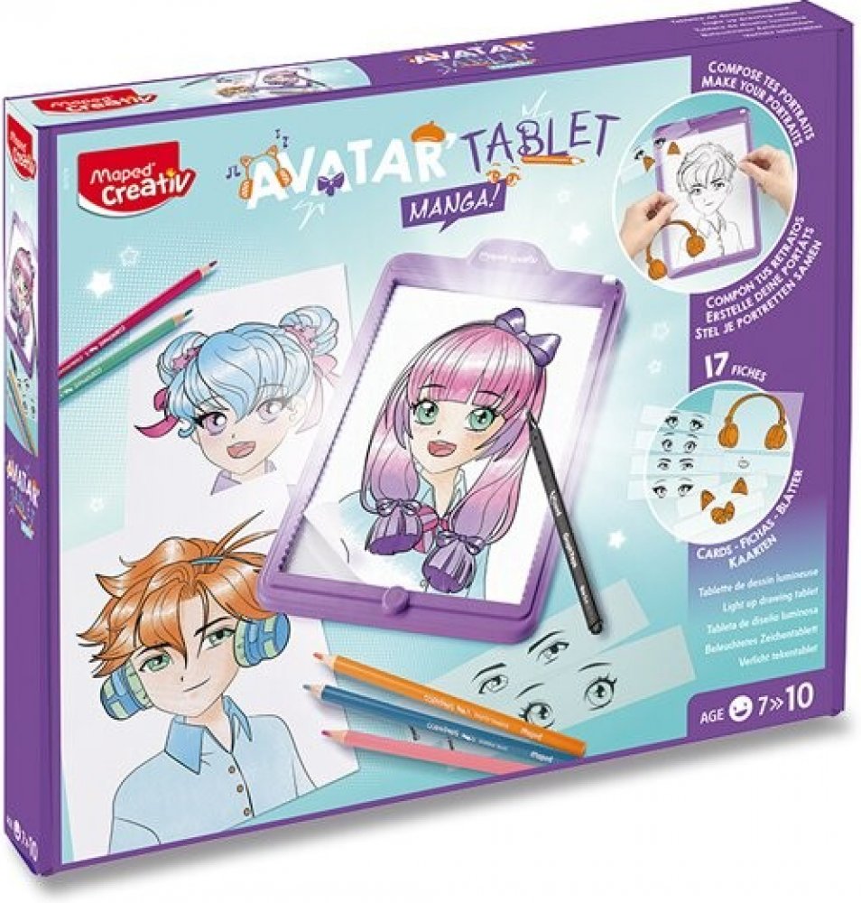 Kreativní sada Maped Creativ Avatar tablet Manga obsahuje podsvětlenou kreslicí podložku, která umožňuje vytváření a kreslení vlastních manga portrétů. Tablet můžete snadno nosit s sebou. Vybírejte, sestavujte a kreslete originální avatary inspirované stylem manga. Staňte se skutečnými ilustrátory. Sada obsahuje různé prvky, které lze libovolně kombinovat a vytvořit tak pokaždé jiný portrét. Tablet rozvíjí kreativitu, probouzí umělecké dovednosti a procvičuje motoriku. Vhodné pro děti od 7 let.