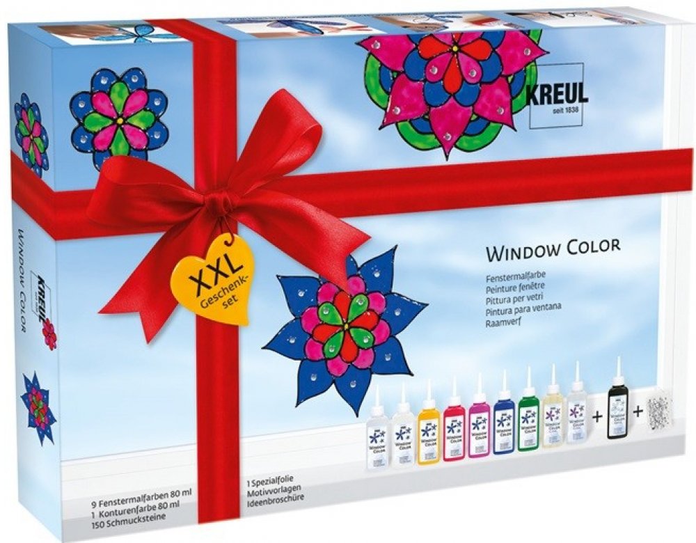 Sada Kreul pro malování na sklo XXL Velká sada barev na sklo KREUL Window Color pro kreativní tvorbu květinových a mandalových motivů. Obsahuje vše, co potřebujete pro malování obrázků na sklo – barvy, fólii, šablony i ozdobné kamínky.
