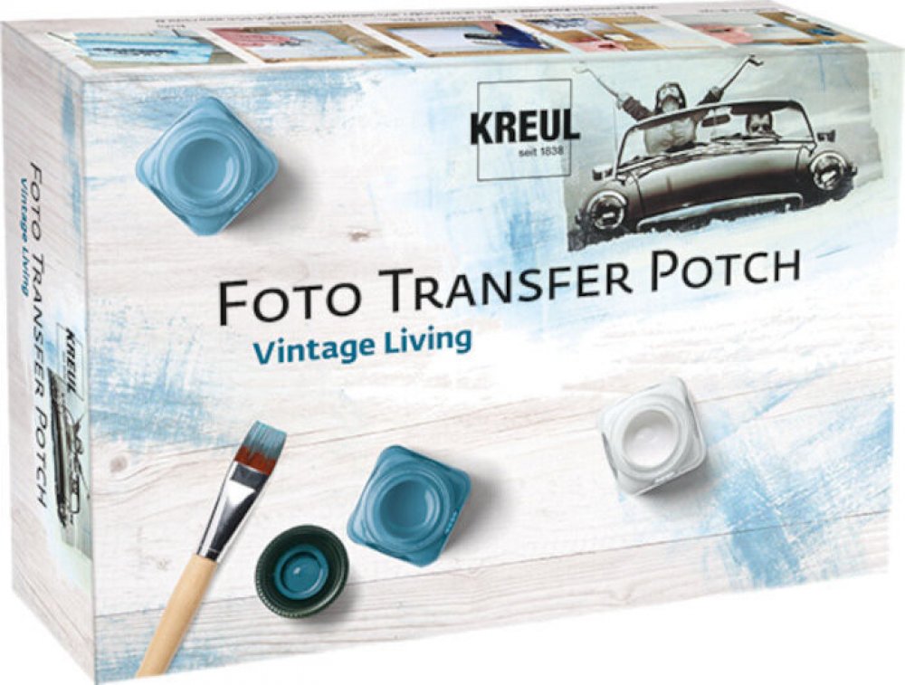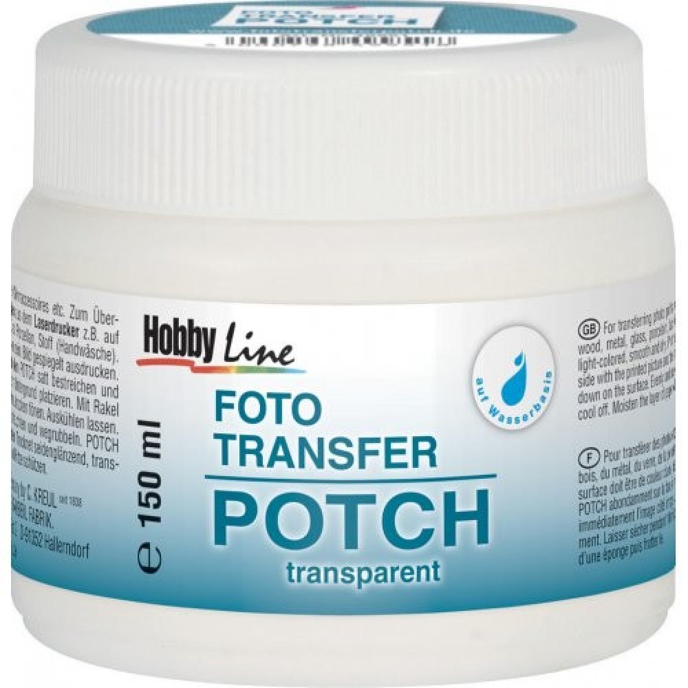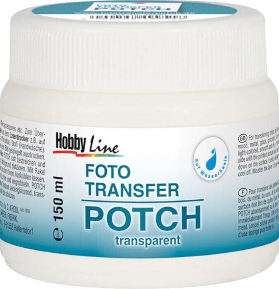 Foto Transfer Potch je lepidlo pro přenos výtisků a kopií fotografií z laserových tiskáren, novinových článků, obrázků z časopisů, atp., na plátno, dřevo, keramiku, kov, sklo, porcelán a látku. Na vodní bázi. Po vyschnutí získá saténový lesk a je průhledné, voděodolné. Může být použit také jako vrchní krycí lak. Sada obsahuje 1x Foto Transfer Potch (50 ml), 1x lesklý lak (50 ml), 1x syntetický ště...