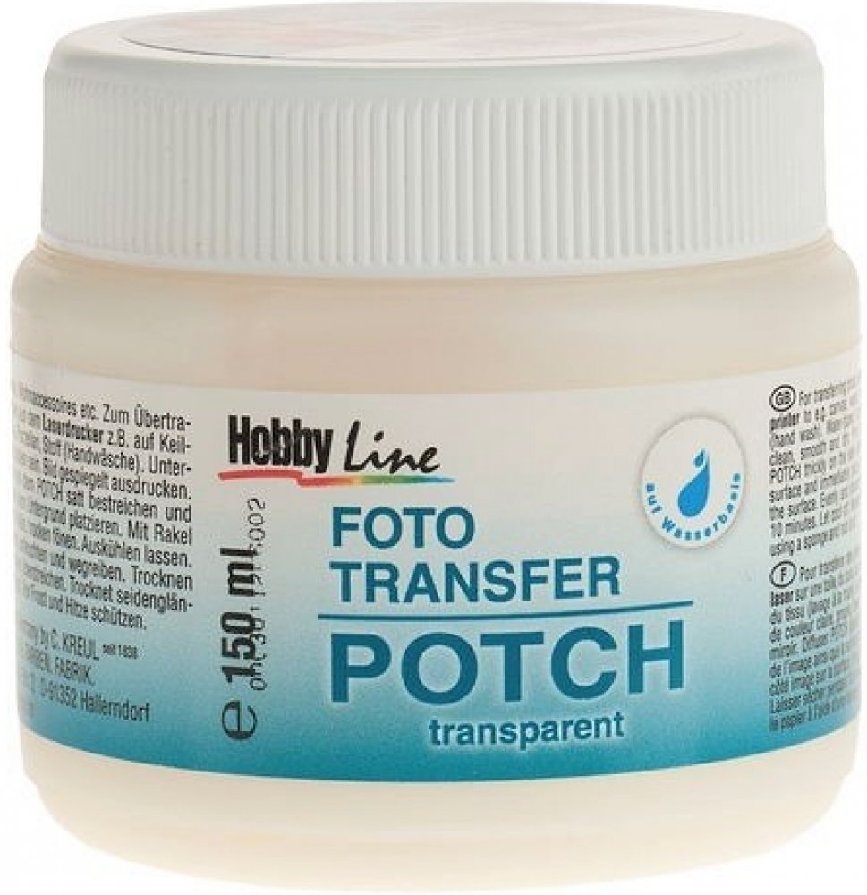 Návod: Vytiskněte nebo okopírujte Vaši originální fotografii na laserové tiskárně. Poté položte fotografii na podklad a naznačte její obrysy. Natřete lepidlem čelní stranu fotografie a dále natřete lepidlem vyznačenou plochu na podkladu souvislou vrstvou. Pracujte rychle! Vezměte natřený obrázek a čelní stranou dolů ho umístěte do obrysu vyznačeného na podkladu "mokré na mokré". Rovnoměrně přitlačte. Přebytky lepidla po okrajích obrázku ihned odstraňte hadříkem. Obrázek důkladně vysušte fénem, nechejte úplně vychladnout. Další možností je sušit 24 hodin při pokojové teplotě. Papírovou vrstvu navlhčete kuchyňskou houbičkou a vyčkejte, dokud papír nezměkne. Nyní papír vydrolte prsty nebo opatrně hrubou stranou houbičky. Zůstane jen voděodolný Potch s přeneseným obrázkem. Jemné bílé zbytky papírových vláken zmizí dalším přelakováním buď další vrstvou lepidla, nebo akrylovým lakem.