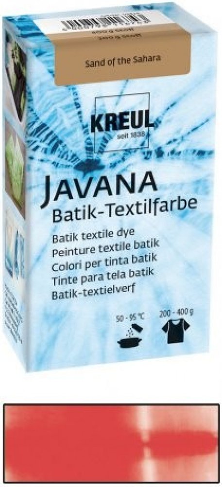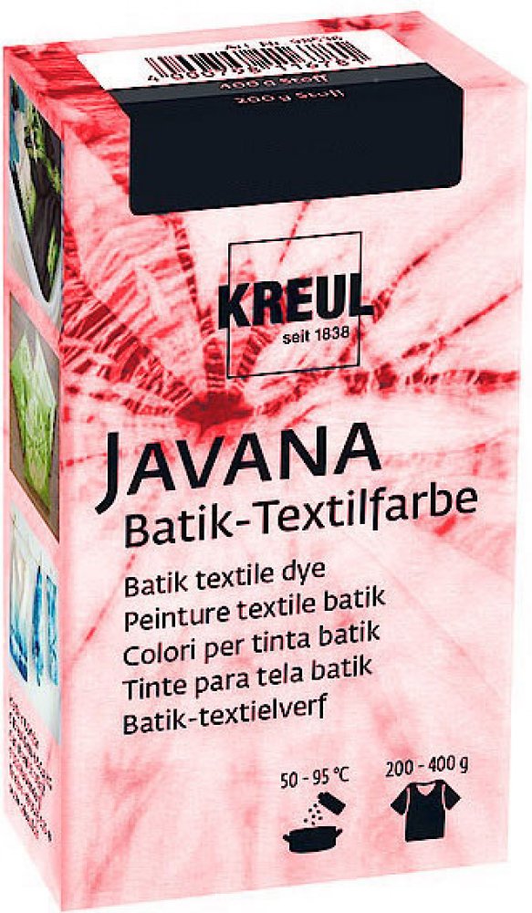 Batikování - unikátní a fascinující kreativní technika Barvivo pomalu proniká do tkaniny a vytváří krásné barevné efekty. Doufáme, že se vám bude pracovat tak dobře jako nám. Charakteristika: pro barvení a batikování bavlny, viskózy, ložního prádla, hedvábí, vlny a polyamidu barvící prášek, který obsahuje barvící sůl nabízíme v praktické opětovně uzavíratelné lahvičce pro jednoduché dávkování, míchání a opětovné skladování doporučujeme přidat ocet při barvení hedvábí a vlny perfektní pro Shibori techniku před barvením tkaninu vyperte. Naplňte nádobu vodou (50-95 st. C) tak, abyste mohli ponořit celou textílii. Vytvořte vzor. Ponořte tkaninu do vody. Nechte působit cca 1 hodinu. Pak vyjměte. barvená tkanina se již nevyváří. Fixujte pomocí KREUL JAVANA FIXING AGENT pro batikování (CK98553) batikované textílie perte separátně na max. 40 st. C fluorescenční barvy svítí neonově pod černým světlem