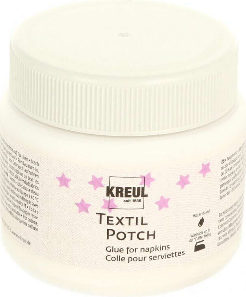 Lepidlo s lakom na dekupáž na textil od KREUL nabízí zajímavý způsob, jak oživit staré oblečení a jednoduše ho ozdobit ubrousky nebo dekupážním papírem. Stačí si vybrat motiv, kterým chcete tričko, mikinu nebo čepici ozdobit, nanést vrstvu lepidla na textil, poté na místo umístit ubrousek a vrchní část opět natřít lepidlem. Nechte 24 hodin zaschnout a poté vložte na 8 minut do trouby při 150 °C nebo na 5 minut přežehlete na rubové straně. Po této fixaci lze dekorované textilie prát na jemný program při teplotě do 40 °C.