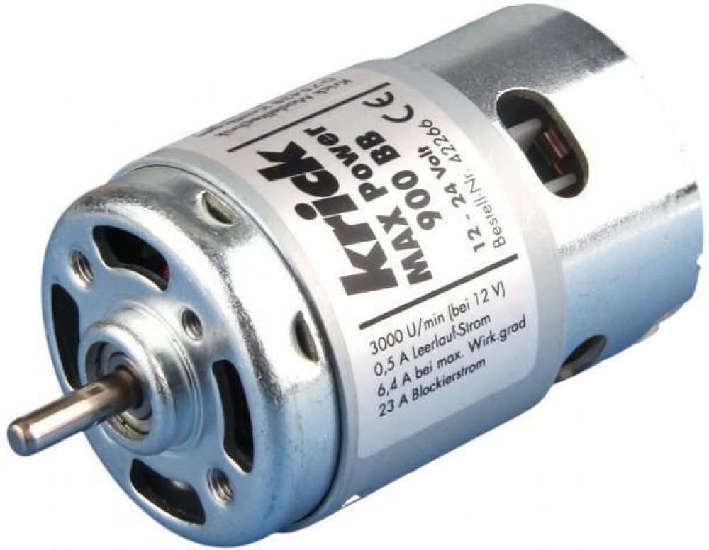 Krick Motor MAX Power 900 BB je stejnosměrný univerzální elektromotor řady 900 s vysokým točivým momentem, nízkou rychlostí, kuličkovými ložisky a vnitřním ventilátorem. Celkový rozměr ø50 x 101 mm, rozměr pouzdra ø48 x 72 mm, hřídel ø 5 mm, jmenovité napájecí napětí 12 V, proud do 24 A.
