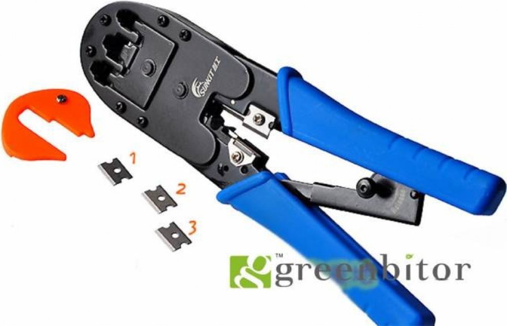 Krimpovací kleště pro upevňování konektorů RJ10,RJ11 a RJ12 na telefonní kabely, pro RJ45 na síťové kabely.