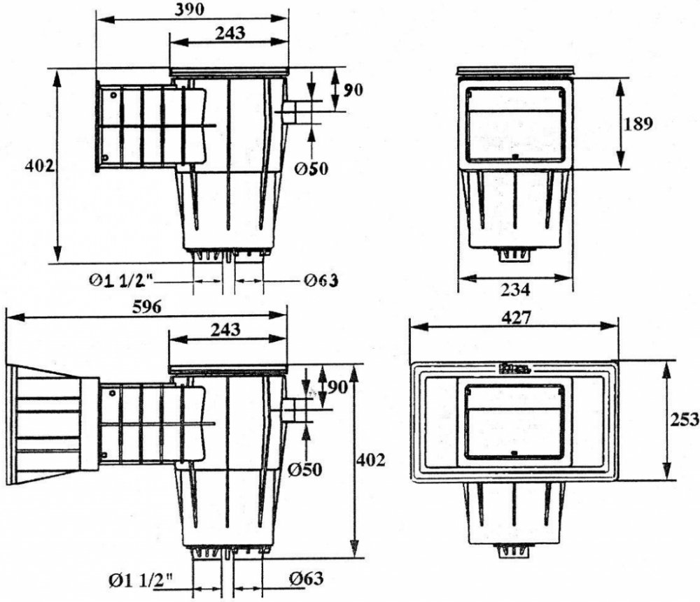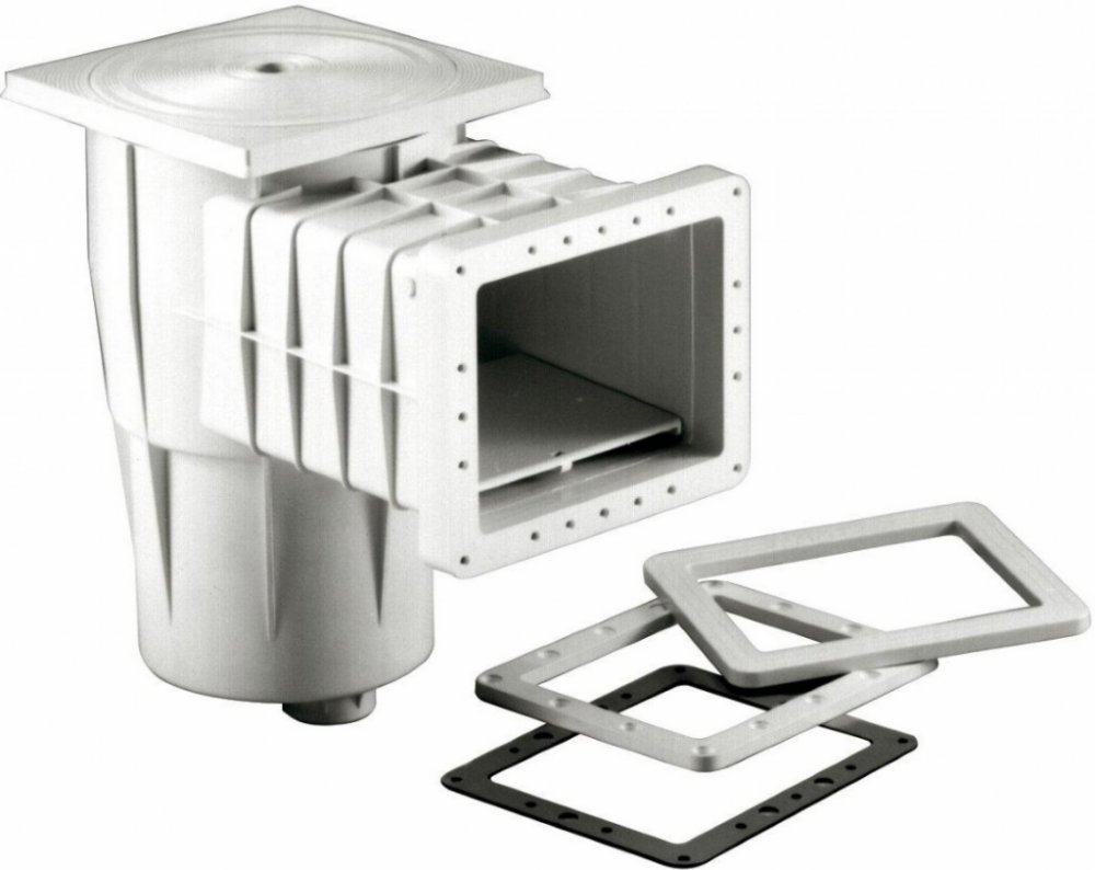 Skimmery KRIPSOL do betonu nebo fólie jsou vyrobeny z bílého vstřikovaného ABS. Kulaté víko upevněné na čtvercový rám. Dvířka sání se závěsy upevněny pomocí snadno vyměnitelných osiček z ABS.