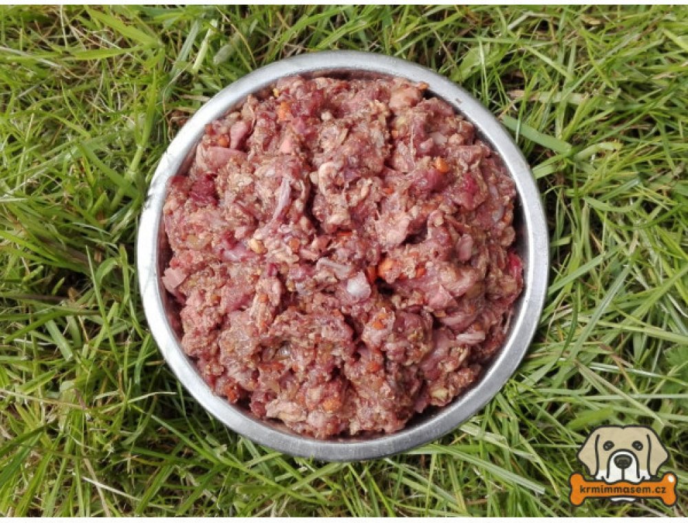 Složení: 30% vepřová svalovina, 30% vepřové chrupavky, 20% zelenina, 10% ovoce, 10% vepřové plíce. Hrubomleté. Váha balení 1 kg.