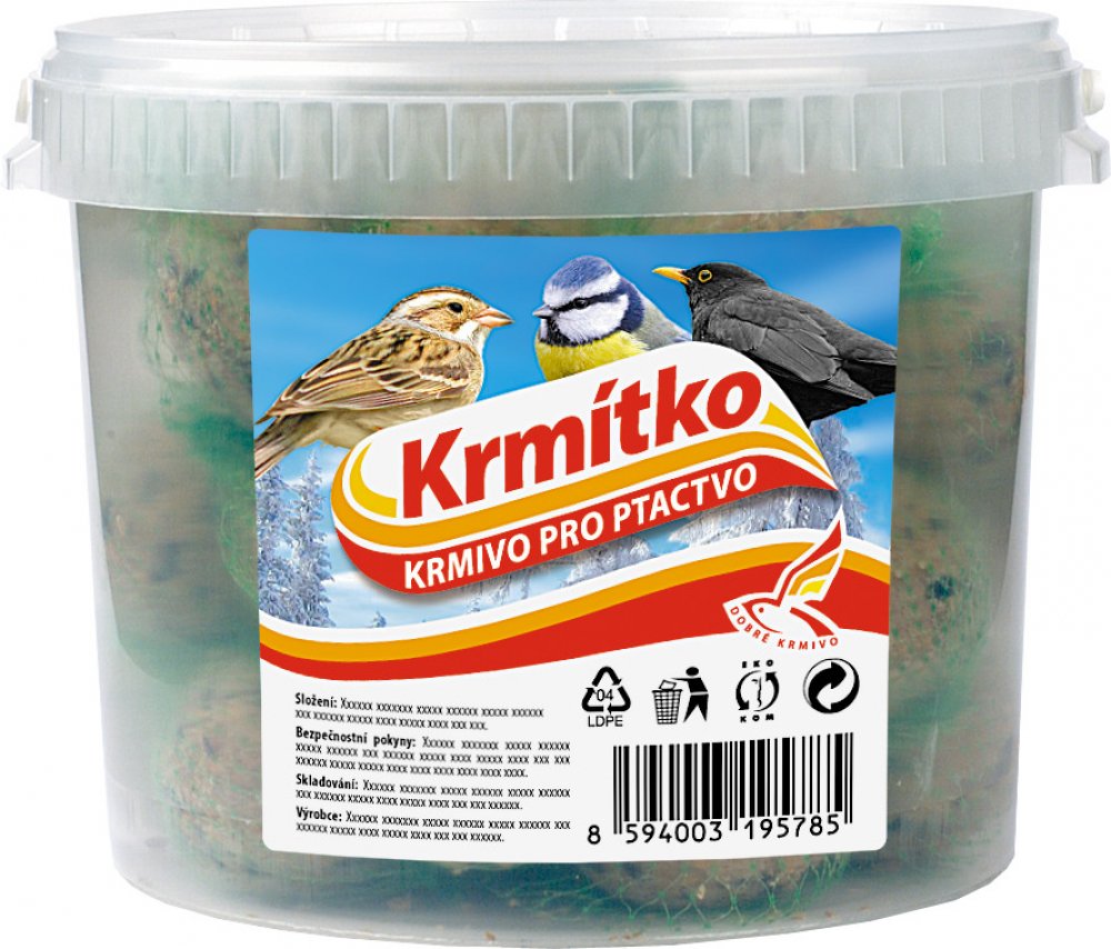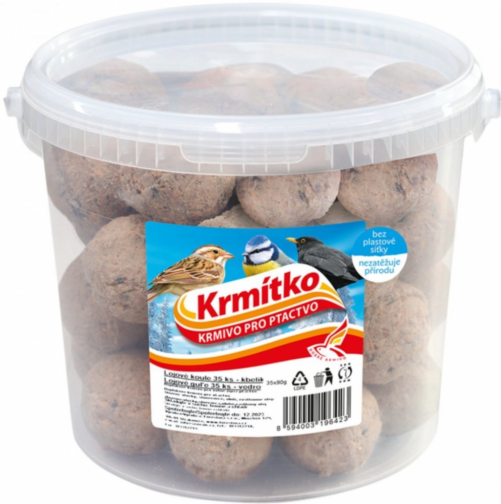 NG 9729fo Krmivo KRMÍTKO lojová koule 35x90g 255x255x195Lojová koule Krmítko je vhodná pro venkovní ptactvo jako doplňkové krmivo. V letních měsících slouží jako příkrm, v zimě při nedostatku potravy jako důležitá část krmiva ptactva. Kouli je třeba umístit na místo chráněné před deštěm. Je v síťce, kterou je možné v případě umístění do krmítka sundat. Skládá se z ovesných a pšeničných vloček, obi...