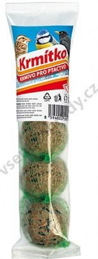 NG 9727fo Krmivo KRMÍTKO lojová koule s bílkovinou 4x90g 240x90x60Lojová koule s bílkovinou Krmítko je vhodná pro venkovní ptactvo jako doplňkové krmivo. V letních měsících slouží jako příkrm, v zimě při nedostatku potravy jako důležitá část krmiva ptactva. Kouli je třeba umístit na místo chráněné před deštěm. Je v síťce, kterou je možné v případě umístění do krmítka sundat. Skládá se z ovesných a pšeničných vloček, obilí, rostlinných olejů, jader slunečnice, „moučních červů“, kobylky luční a rostlinných olejů. V balení jsou 4 lojové koule po 90 gramech.