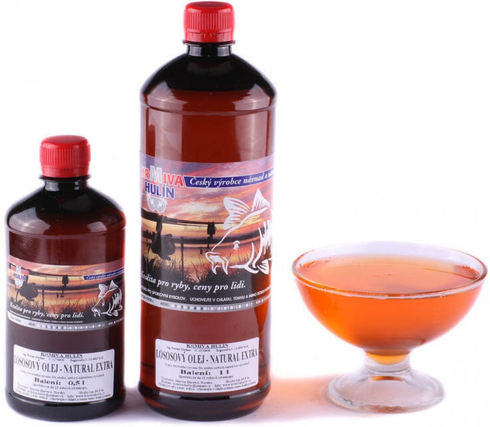 Výběrový olej z norského lososa, bezvodý, v chladu netuhne, vhodný i do studené vody, neředěný, čistý, bez příměsí. Země původu - Norsko. Charakteristika: Přírodní, čistý lososový olej, bez příměsí jiných druhů olejů, s typickou lososovou, jantarovou barvou. Je odvodněný, takže netuhne ani při nízkých teplotách do cca - 10 °C. Proto je vhodný i pro zimní rybolov! Má jemný, charakteristický rybí pach. Je ve vysoké krmivářské kvalitě pro hospodářská zvířata. Jedinečný zdroj nenasycených a vícenenasycených mastných kyselin (tzv. omega kyselin). Vhodný i jako krmný doplněk pro domácí zvířata, hlavně pro psy a kočky. Použití: Neměl by chybět jako přídavek v žádné směsi, ať již rybí, sladké, nebo masové, především při rybolovu v chladnějším období podzimu až jara. Jedinečný na macerování pelet a boilies. Podpoří a zvýrazní příchuť rybího masa. Vynikající příloha do krmiva pro psy jako ochucovadlo ! Doporučená doba spotřeby od nákupu, v temnu a při teplotě do 12 °C - 12 měsíců. Doporučené dávkování: 30 – 60 g / kg u silných směsí s rybí moučkou 60 – 120 g / kg u slabších masových, nebo rybích směsí 0,8 litrů / 10 kg při macerování pelet a boilies
