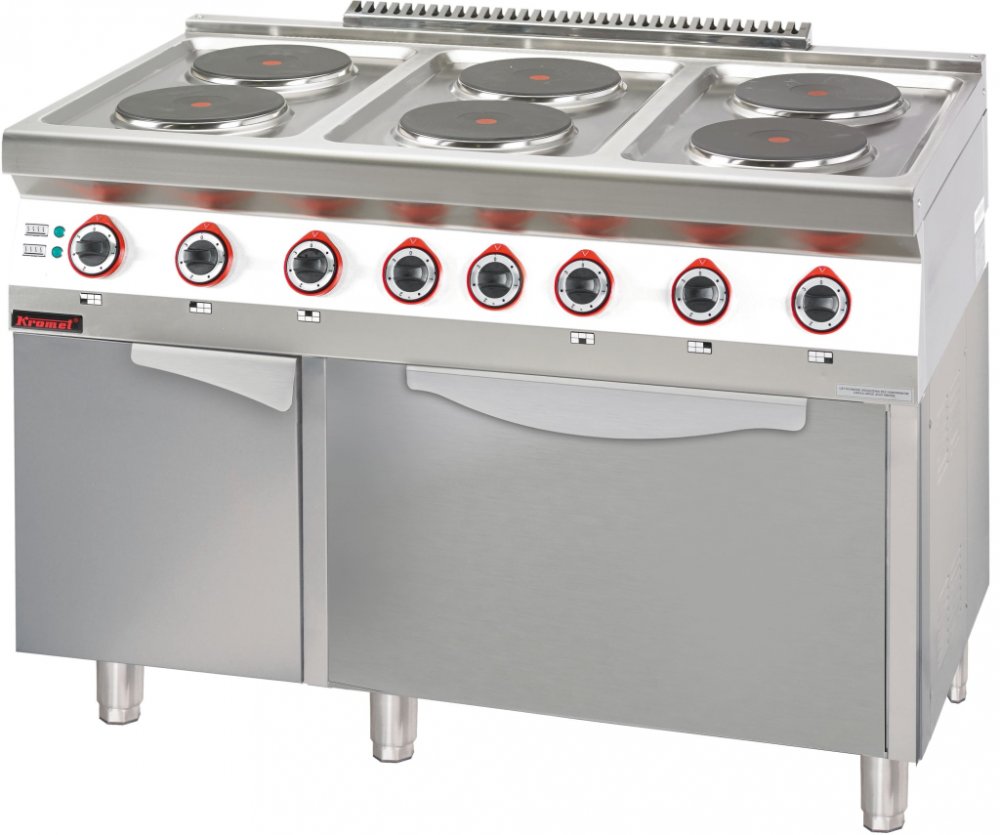 Elektrický sporák s šesti plotýnkami s elektrickou troubou a skříní. Rychlo ohřevné plotýnky zajišťují vysokou úroveň pracovního komfortu, zkracují dobu potřebnou k zahřátí povrchu na požadovanou teplotu, a tím snižují výdaje za energii. Trouba s velikostí GN 2/1 a praktickou úložnou skříňkou.- Teplotní rozsah: plynule nastavitelný od 50°C do 250°C- Ohřev trouby: horní, dolní, horní a dolníVýkon: ...