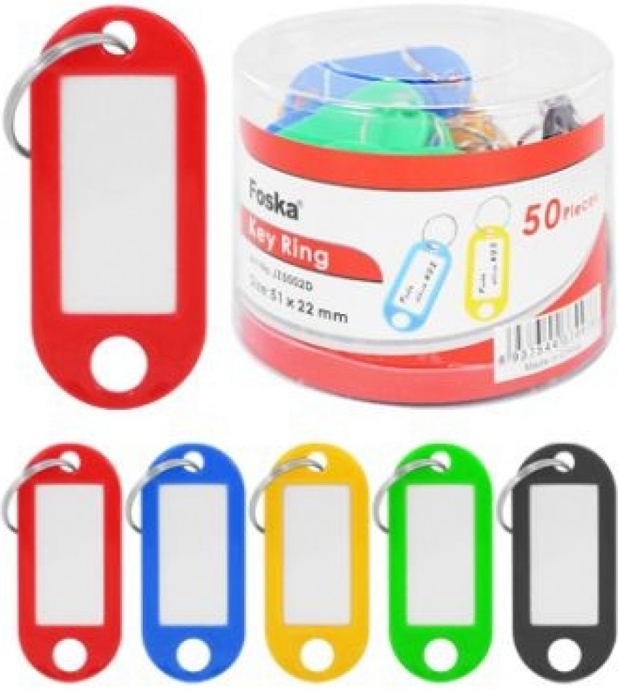 Jmenovky na klíče s kroužkem, vyrobeny z plastu. Balení po 50 ks - mix 5 barev.