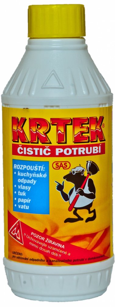 Krtek čistič potrubí je určen pro udržování odpadního a kanalizačního potrubí v domácnostech. Snadno a rychle rozpustí kuchyňské odpady, vlasy, tuk, papír, vatu. Je velice agresivní. Nelze ho použít na hliníkové potrubí. Snadno a hravě si poradí s jakýmkoliv odpadem, který se nachází v odtoku.