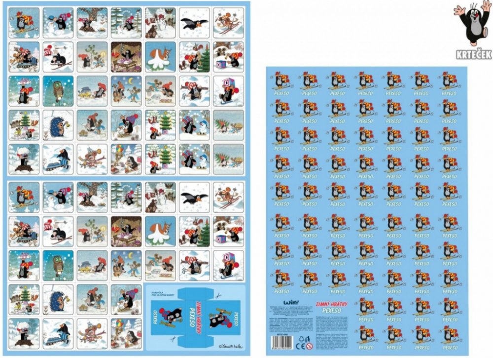 Vystřihovací pexeso Krtek - Zimní radovánky. Jedná se o pexeso s motivy Krtka a jeho přátel, které je zaměřené na zimní tématiku. Pexeso je tradiční stolní hra, která slouží k procvičování paměti a soustředění. Hra rozvíjí schopnost zapamatovat si, kde se jednotlivé obrázky nacházejí, a podporuje tak kognitivní dovednosti, především paměť a koncentraci. Pexeso je oblíbené mezi dětmi, ale také dospělými, protože je zábavné a jednoduché na pochopení. NÁVOD KE HŘE PEXESO: Pexeso mohou hrát nejméně dva hráči. Všechny rozstříhané kartičky se zamíchají a rozloží obrázkem dolů do čtverce 8 x 8 kartiček. Nesmí se při tom dívat na obrázek. Hráči si určí pořadí hry. Hráči postupně otáčejí vždy dvě kartičky s cílem najít dvojice se stejnými obrázky. Pokud hráč najde dvojici, ponechá si ji a pokračuje v tahu. Pokud ne, kartičky se otočí zpět lícem dolů a hraje další hráč. Cílem hry je nasbírat co nejvíce dvojic, a tím se stát vítězem. PAPÍR: křída matná 350 g + lamino lesk 1/1 VELIKOST HRACÍCH KARET: 51x51cm VAROVÁNÍ: Nevhodné pro děti do 3 let. Nebezpečí vdechnutí a spolknutí malých částic. Uvedená cena je za 1 ks.