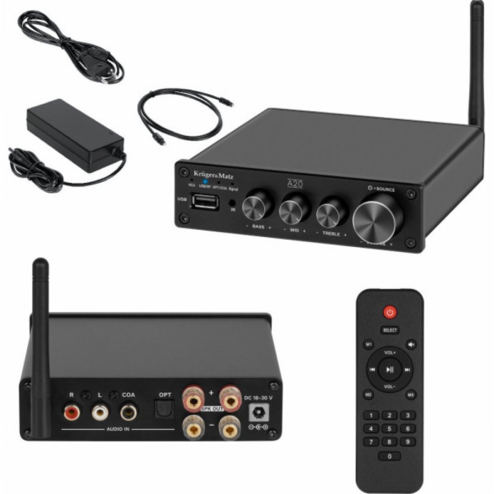 Stereo zesilovač Kruger&Matz A20 Stereo zesilovač Kruger&Matz A20 je produkt pro ty, kteří očekávají něco víc než jen standardní zvuk. Tento model se od prvních okamžiků stane srdcem vašeho audiosystému, který díky výkonu 2x 100 W poskytne neuvěřitelnou čistotu a hloubku zvuku. Vše, co potřebujete Přední panel zesilovače A20 obsahuje: multifunkční knoflík pro zapnutí zařízení, nastavení hlasitosti...