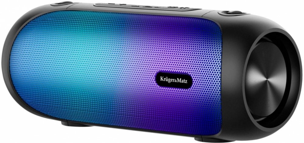 Kruger&Matz 5 h aktivní 2 IPX5 na baterie i do sítě 3000 mAh 29.5 cm 12.2 cm 12.0 cm 1.6 kg Přenosné venkovní / party pokojové nadstandardní voděodolné USB-C Stereo párování 2 30 W 2.0 4.0 ohm 80 Hz 20000 Hz 5