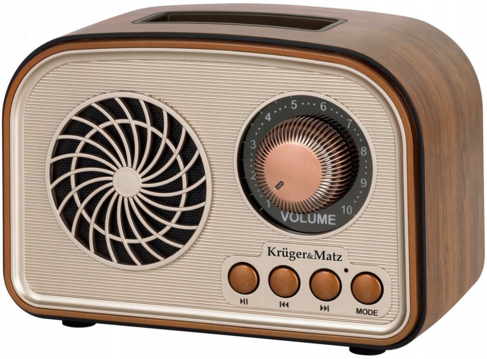 Analogové rádio Kruger&Matz kombinuje klasický design s moderními funkcemi. Díky rádiu AM/FM/SW, přehrávání hudby přes Bluetooth a několika multimediálním vstupům je ideální pro použití doma, v dílně nebo na pozemku. Vestavěná dobíjecí baterie a možnost napájení z baterie zajišťují přenosnost v každé situaci.Retro designUnikátní retro design dělá z tohoto rádia dekorativní doplněk do každého interiéru. Inspirováno klasickými rádii, v kombinaci s elegantními detaily a dynamickým LED podsvícením vytváří jedinečný vizuální efekt. Je to perfektní volba pro nadšence vintage stylu, kteří zároveň požadují moderní funkčnost.Rádio KM 834 podporuje Bluetooth 6.0, což vám umožňuje bezdrátově přehrávat hudbu z vašeho smartphonu. Vstupy USB-A, AUX a microSD vám navíc umožňují připojení k různým zdrojům zvuku. Tato všestrannost dělá z rádia centrum domácí zábavy, které nabízí širokou škálu možností poslechu hudby.LED indikátoryFrekvence FM rádia: 87 – 108 MHzReproduktor: 2” (50 mm)Impedance: 4 OhmVýstupní výkon: 5 WBluetooth 6.0Frekvenční rozsah Bluetooth: 2402 – 2480 MHzMax. výstupní výkon Bluetooth: 96 dBVstupy:• AUX vstup (3,5 mm jack)• Slot pro kartu microSD (max. 64 GB)• USB-A vstup• USB-C vstup (nabíjení)Provozní doba na jedno nabití: Až 80 minutDoba nabíjení: Až 3 hodinyVestavěná baterie: 18650, 3,7 V; 1200 mAhSpotřeba energie: 6 WNapájení: 5 V / 1 AHmotnost: 629 gRozměry: 185 x 77,5 x 150 mmObsahuje: Kabel USB-C (64 cm), AUX kabel (44 cm)Bezpečnostní upozornění:Nepoužívejte zařízení ve vlhkém nebo mokrém prostředí — hrozí zkrat a poškození elektroniky.Nevystavujte rádio dešti, sněhu ani kondenzaci.Neotevírejte kryt zařízení a nepokoušejte se o vlastní opravy — hrozí riziko úrazu elektrickým proudem.Používejte pouze doporučený napájecí zdroj nebo správný typ baterií.Nevystavujte vysokým teplotám, přímému slunečnímu svitu nebo zdrojům tepla.Anténa může být ostrá — dbejte na opatrnost při manipulaci a uchovávejte mimo dosah malých dětí.Při použití reprodukce MP3 či rádia nastavujte hlasitost tak, aby nedošlo k trvalému poškození sluchu.Pokud zařízení začne vydávat zápach, přehřívat se nebo vykazuje závadu, ihned jej vypněte a odpojte od napájení.Nepokládejte zařízení na měkký povrch, který brání odvětrávání (deka, polštář apod.).Při čištění zařízení nepoužívejte chemické rozpouštěče — čistěte pouze suchým nebo mírně vlhkým hadříkem.