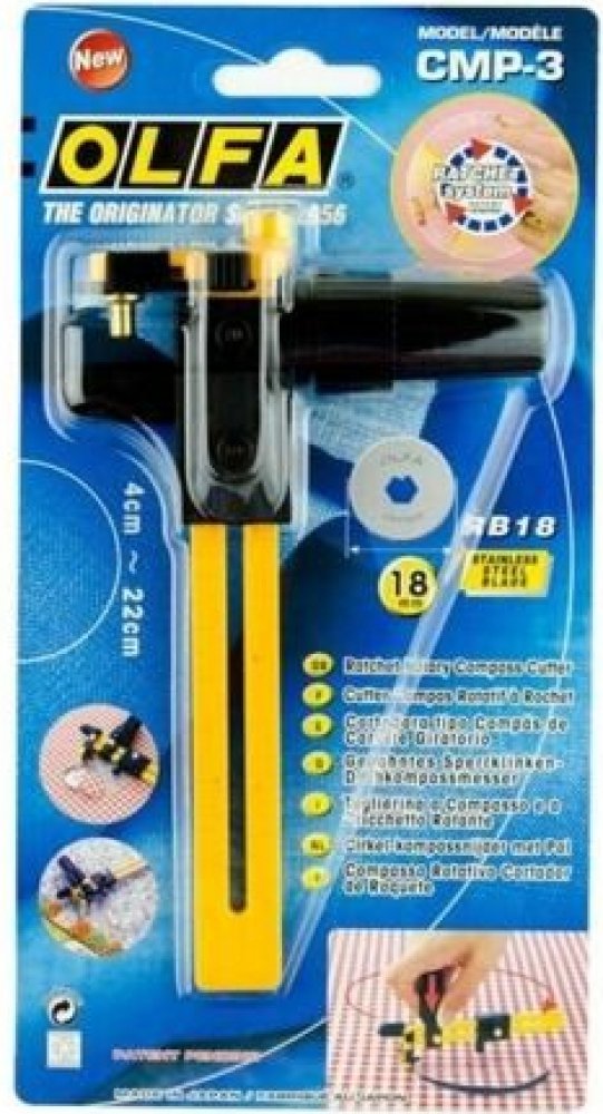 Kruhová řezačka (kružítko) CMP-3 OLFA Střední kružítko s řezacím kolečkem, které je opatřené ráčnou. Průměr řezu kružítka je 4 - 22 cm. Kružítko je opatřeno čepelí typu RB18. Kruhový řezač je vhodný pro řezání látek - na patchwork, quilt apod. Poloměr řezané kružnice je od 4 cm do 22 cm. Šířka nože: 18 mm Návod na použití: Nastavte bod kružítka podél pravítka na požadovanou velikost kružnice a odstraňte ochranný kryt. Odemčete nůž. Pracujte UPOZORNĚNÍ: Nůž je extrémně ostrý. Udržujte mimo dosah dětí!
