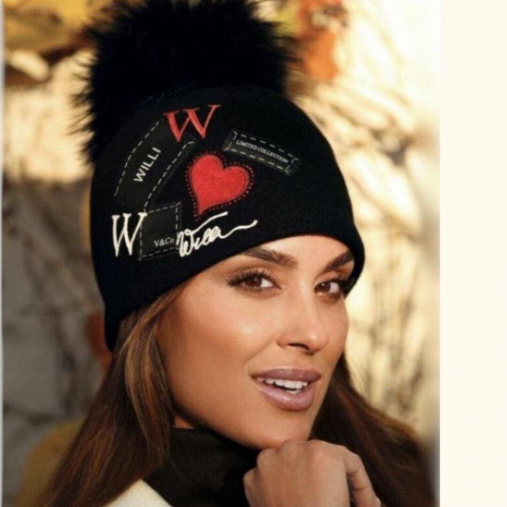Zimní černá čepice vyrobená z certifikované vlny WoolMark. Čepice s bambulí je ozdobená ručně originální nášivkou, která dodává čepici módní styl. Doplňkovou ozdobou je našité srdce obklopené červenými tryskami a velká přírodní bambulka. Díky měkké vlně se čepice přizpůsobí každé velikosti hlavy. Výrobek má teplou a měkkou flísovou podšívku.