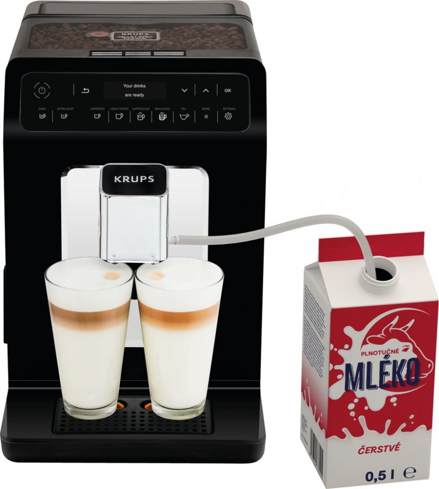 Vybrat si můžete z 15 druhů nastavení nápojů včetně cappuccina One-Touch, klasického espressa, latté a celé škály všech vašich oblíbených nápojů. Výraznější chuť si můžete nastavit díky funkci extra porce, která do jakéhokoliv nápoje přidá espresso, případně si můžete nastavit volbu tmavé kávy pro ještě silnější chuť. KRUPS Evidence je absolutně výjimečný funkcí automatické přípravy dvou mléčných nápojů současně. Snižuje tak dobu přípravy na minimum. Funkce dvojité přípravy je dostupná jednoduchým dvojnásobným stiskem tlačítka požadovaného nápoje.