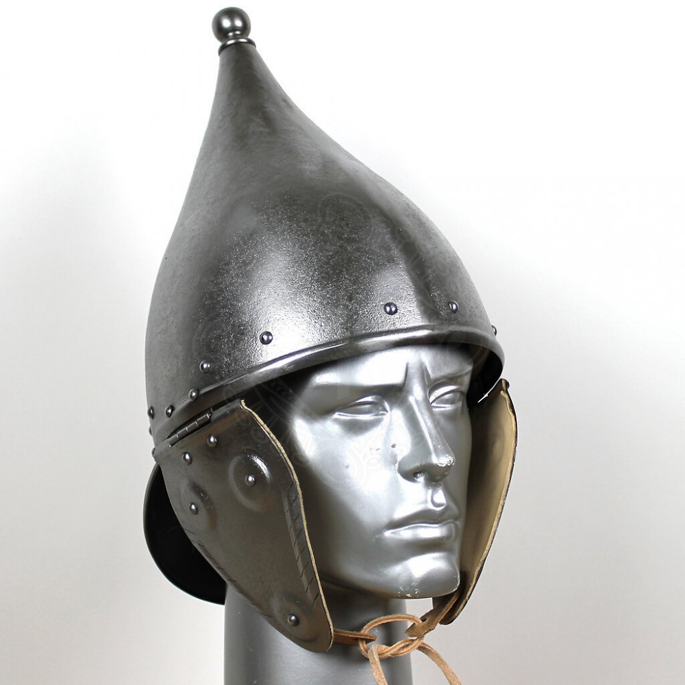 Kónická přilba La Tène patinovaný povrch za příplatek lícnice a týlní štít pertlované kožená výstelka lícnice zevnitř polepené kůží zavazování na kožený řemínek konci lícnic Hmotnost cca 2480g (při síle plechu 2mm) Tuto helmu Vám můžeme vyrobit přesně na míru podle údajů ‘1a’ až ‘1j’ v této tabulce rozměrů. Přečtěte si prosím návod, jak zvolit správnou velikost helmy.