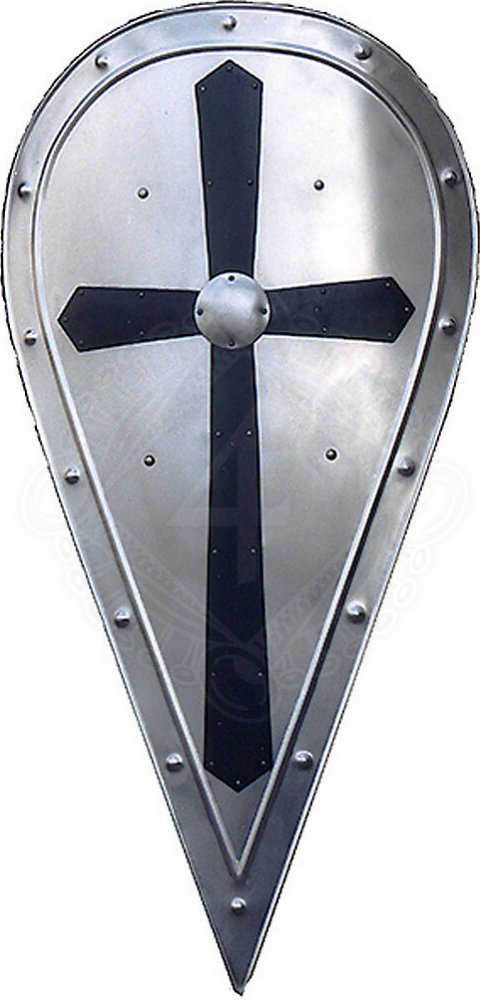 Normanský mandlový štít s černým křížem Jedná se o funkční provedení vhodné na šerm. Vyrobeno v Čechách. Výška cca 103cm Šířka cca 50cm Síla železného plechu volitelná: 1,5mm a 2,0mm hmotnost, když je vyroben ze síly materiálu 1,5mm … cca. 7 kg hmotnost, když je vyrobena ze síly materiálu 2,0mm … cca. 10 kg Nejznámější vyobrazení mandlového štítu se nachází na tapisérii z Bayeux, která popisuje normanskou invazi do Anglie v roce 1066. Díky tomuto zobrazení se tento štít často označuje jako normanský mandlový štít, a to navzdory skutečnosti, že se vyskytoval po celé Evropě i v Byzantské říši. Má se za to, že tento druh štítu vymysleli řečtí zbrojíři současně s evropskými, a to nezávisle na sobě. Předpokládá se, že vznikl vývojem ze štítu oválného. Svou popularitu u profesionálních vojáků získal zejména díky tomu, že chránil při boji zblízka mimo trupu i vysunutou nohu vojáka, ať už se jednalo o pěšáka či jezdce.