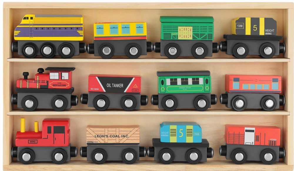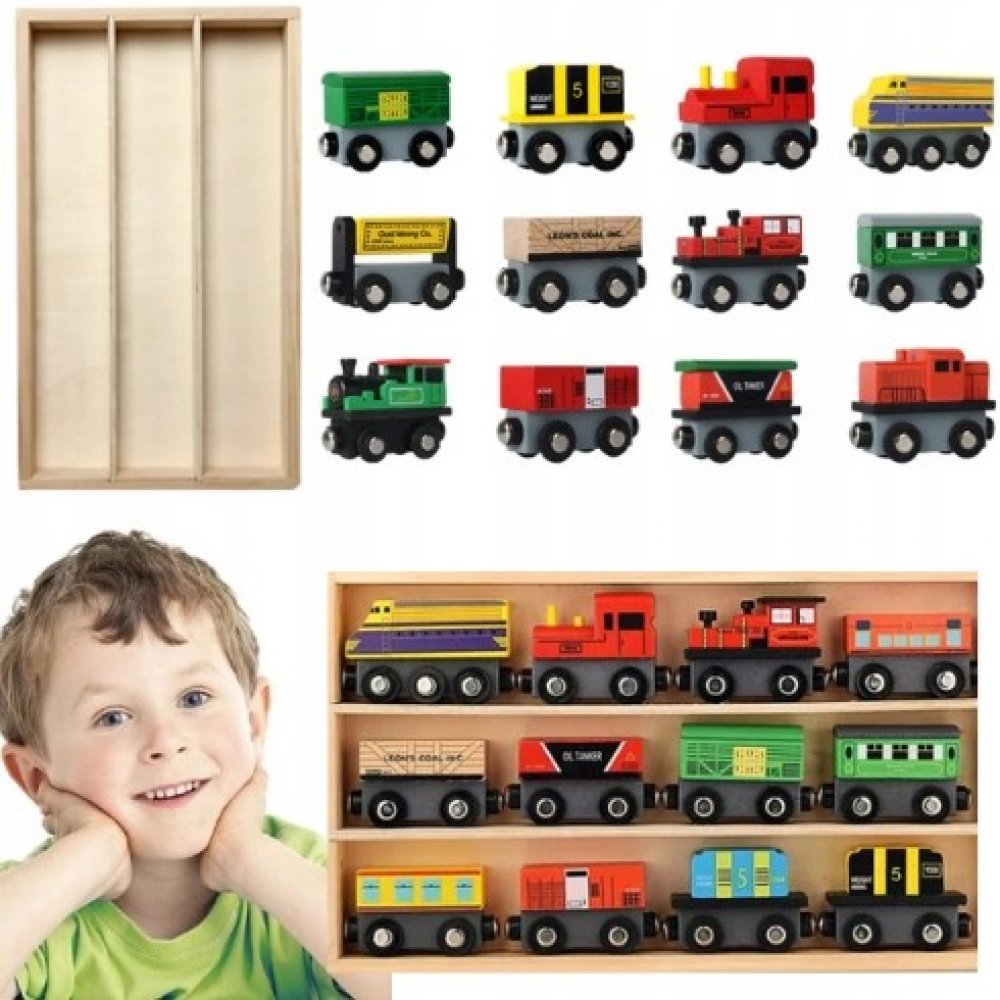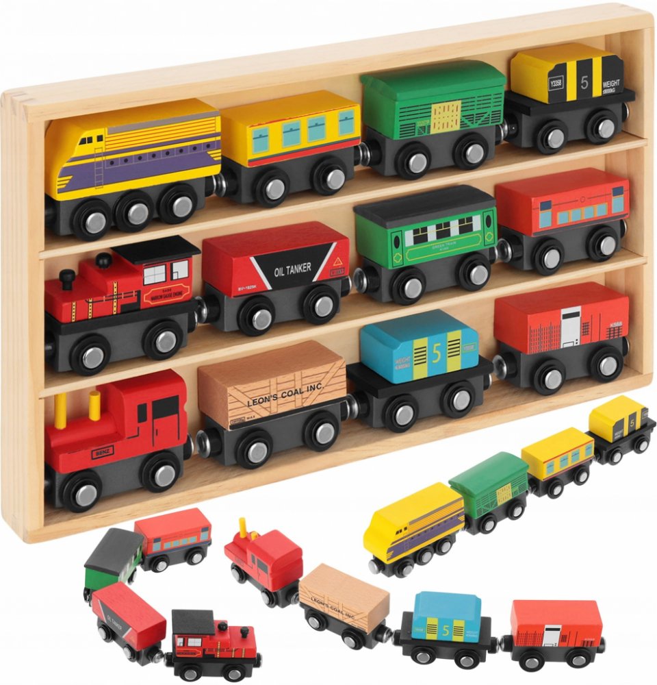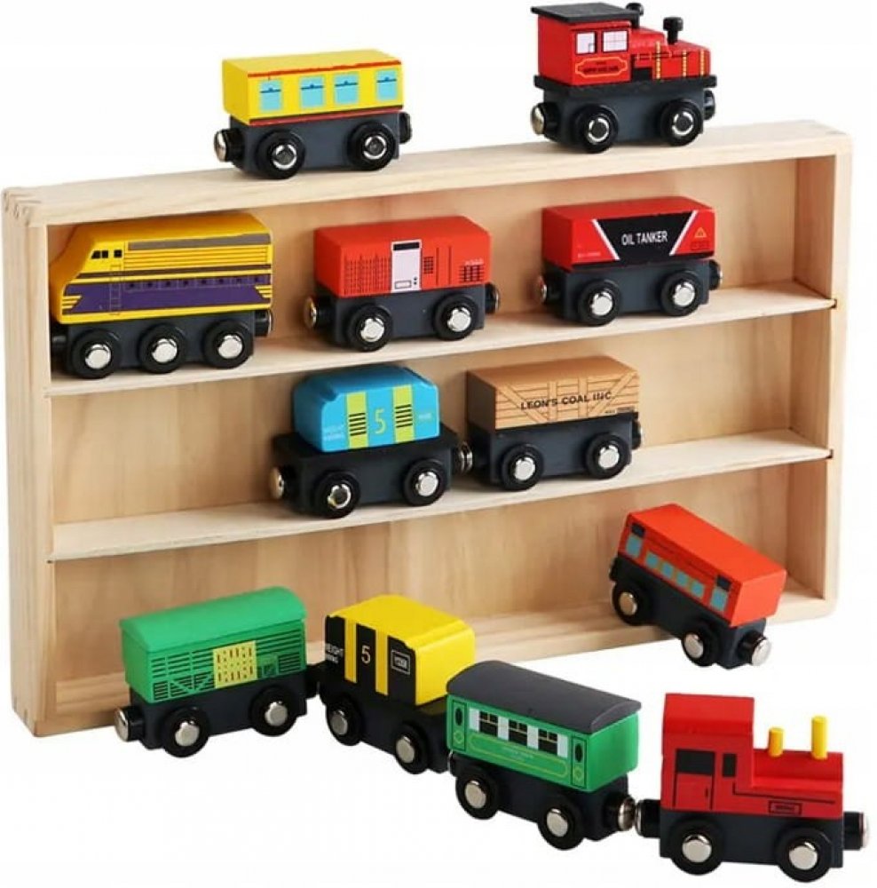 HODNĚ PRVKŮ - sada obsahuje mnoho prvků - skládá se ze 3 lokomotiv a 9 vagónů v různých barvách, takže dřevěná železnice bude skvělou hračkou.