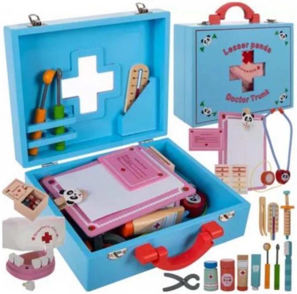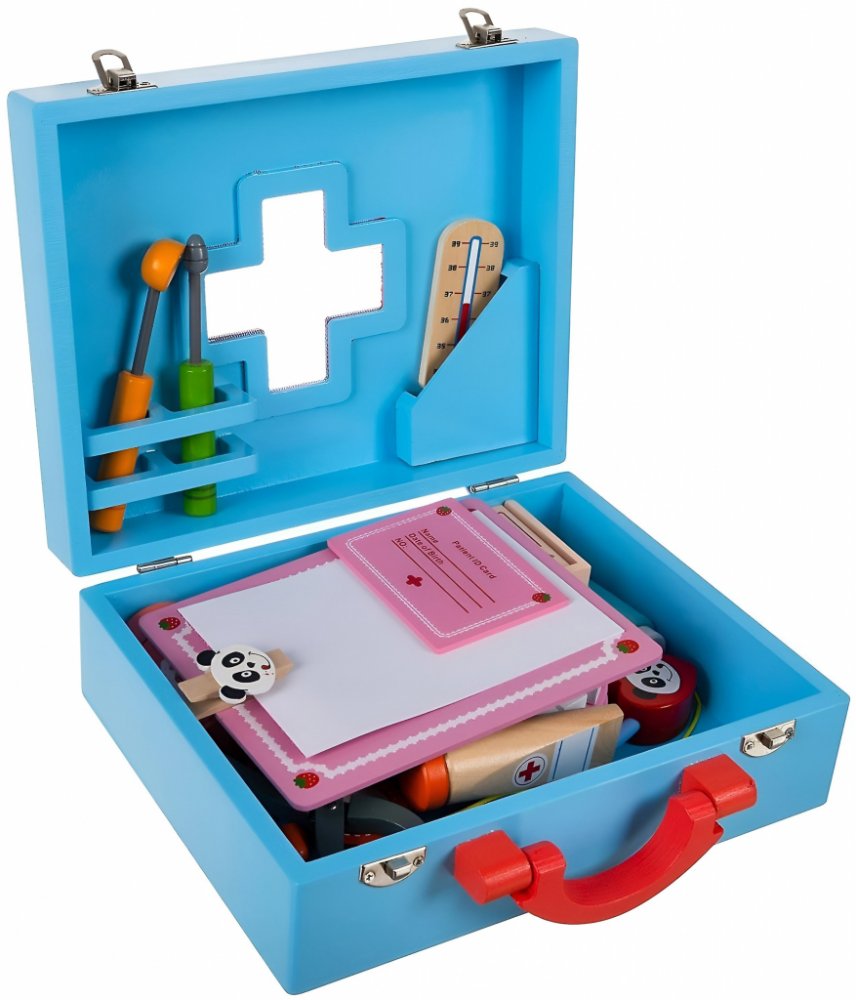 - BOHATÁ SADA - tato atraktivní sada je velmi velká. Sada obsahuje kufr, notebook, studijní čelist, stetoskop, čepici pro sestru, samolepky, teploměr, 2 x pastu, kleště, injekční stříkačku, štětec, zrcátko, pinzetu, dláto, 2 balíčky s tabletami a občanský průkaz.