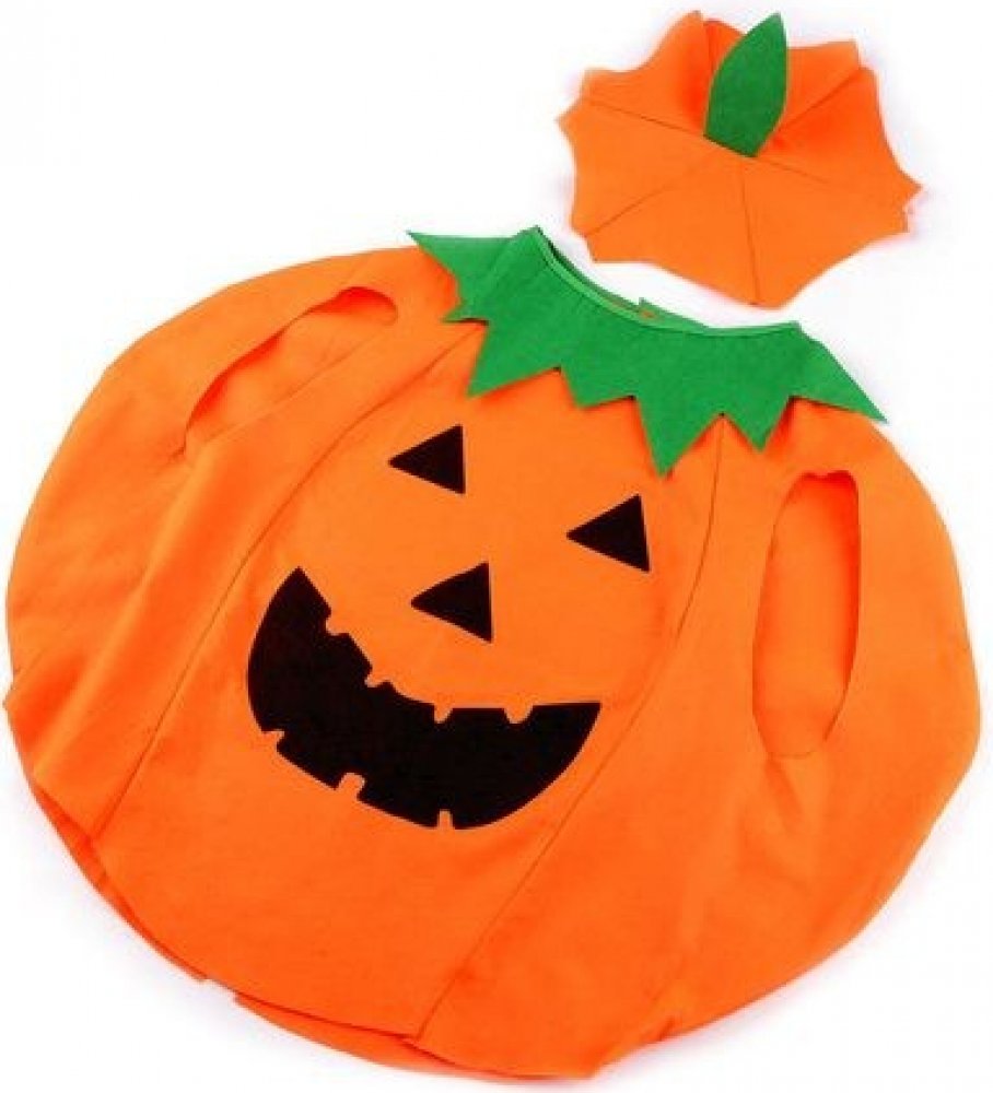 Karnevalový kostým promění každé dítko v roztomilou dýni. Je vyrobený z pestrého barevného filcu. Má velké otvory na ruce, zapíná se v zadní části na suchý zip. Ke kostýmu patří čepička s lístečkem, která na hlavě drží díky pružence.